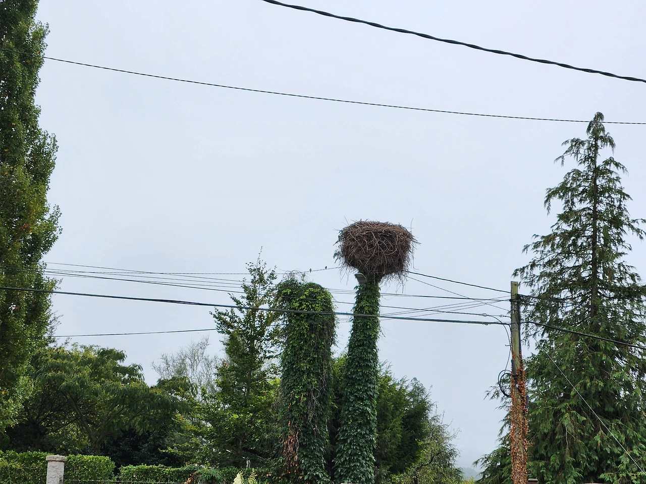 안개 낀 저 멀리로 종탑이 어슴프레 보이다.