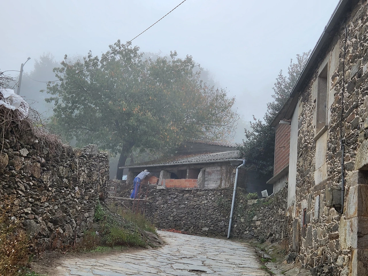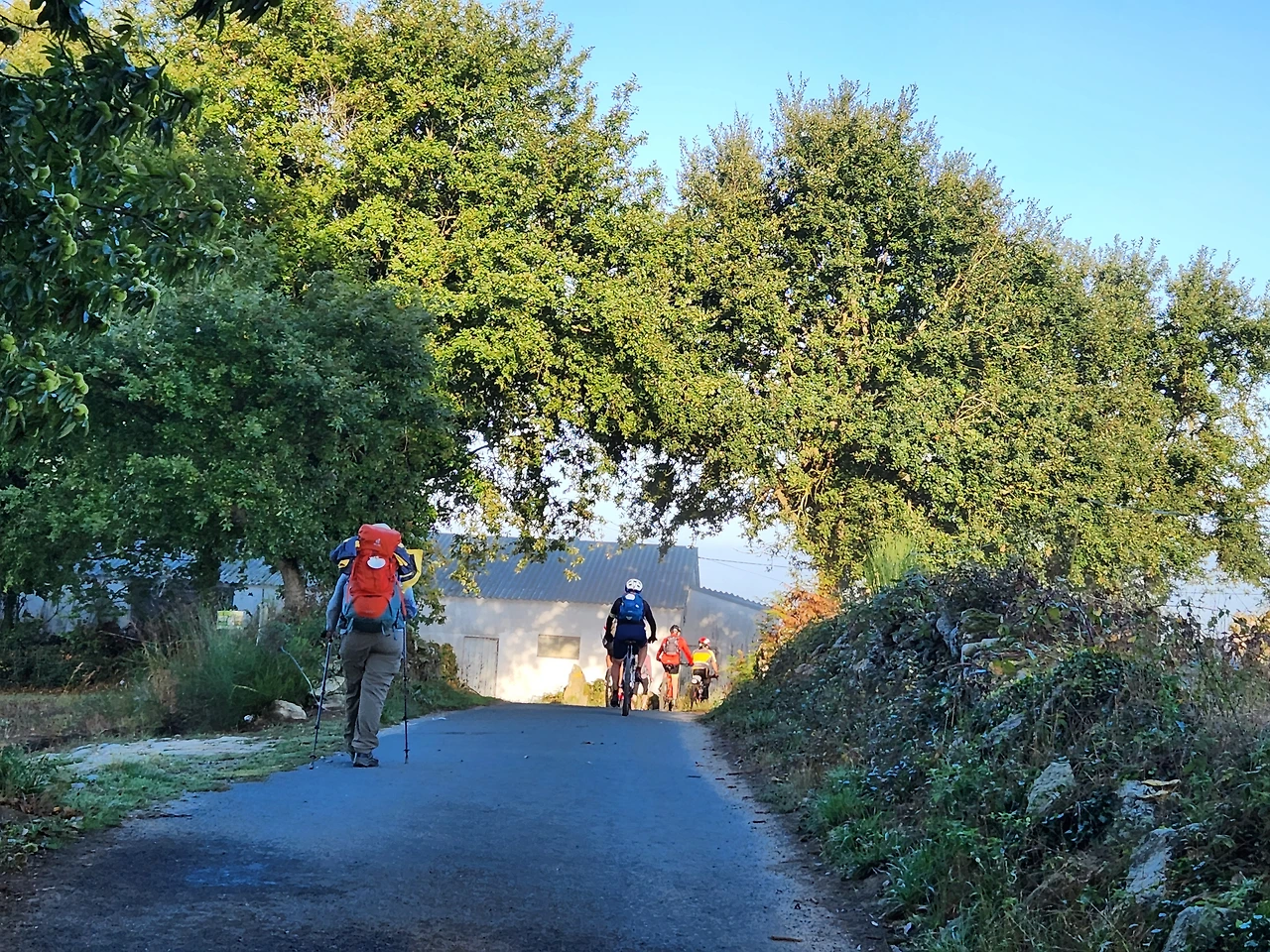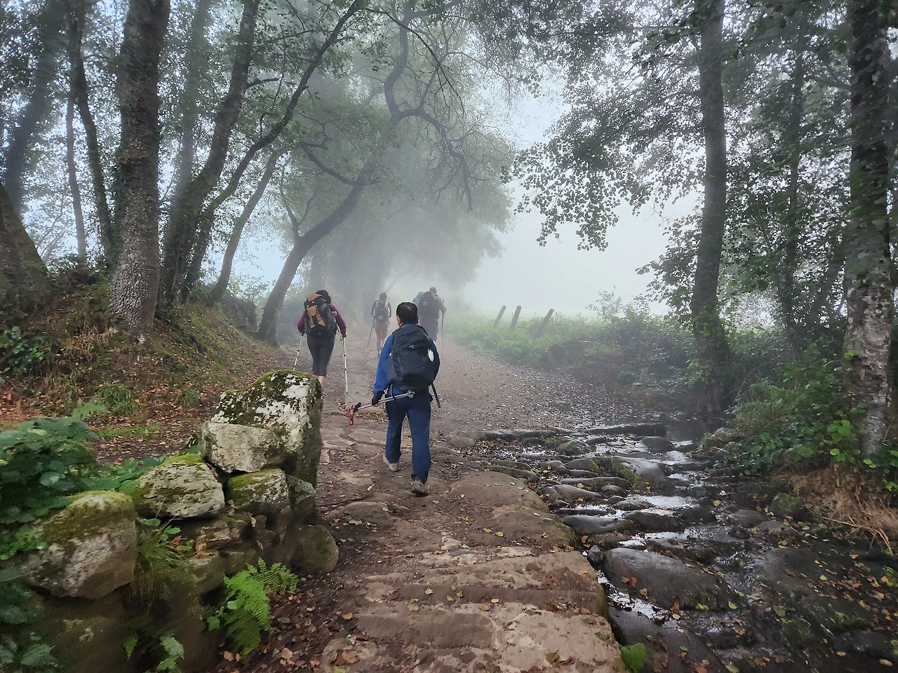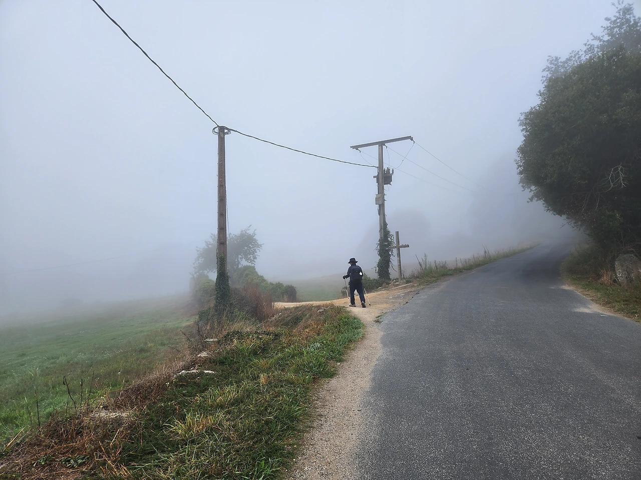 안개 낀, 어두운 숲을 걸어 나서는 아침이다. 사리아부터 걷는 사람도 많다더니 아침부터 줄줄이 긴 행렬을 이루다.
