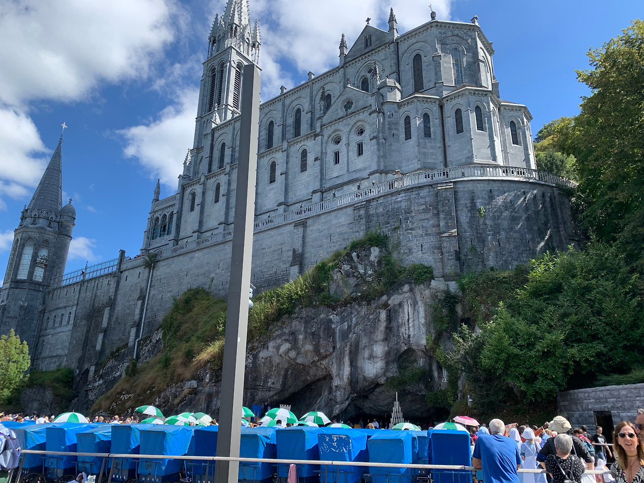 루르드 역은 대합실 의자도 몇 안 되게 작고 아담했다. 역 근처 호텔에서 20분쯤 걸어가니 정면에 루르드 성지로 향하는 다리가 나온다. 다리를 가로지르는 갸브 드 뽀 강은 초록빛으로 반짝이고 강 오른쪽엔 멋진 나무들과 호텔과 성곽이 보인다. 그 뒤로는 야트막한 산이 둘러쳐 있고 하얀 구름이 몽실몽실 걸려있다. 사진을 찍으며 성지에 도착하니 5m나 되보이는 커다란 십자고상이 나를 맞아준다.