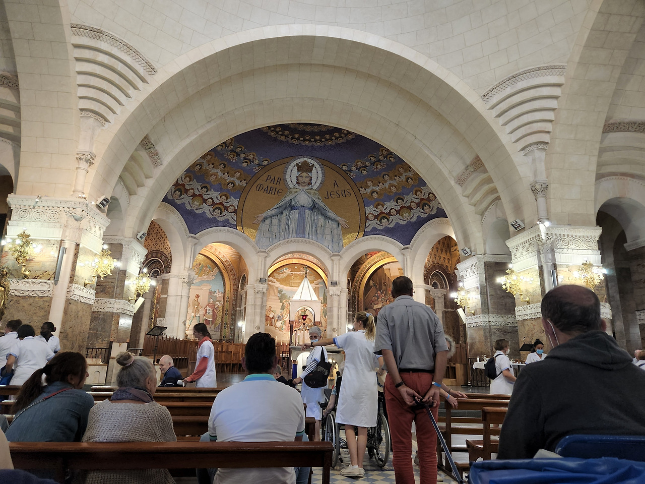 인기척이 느껴지더니 내 옆에 휠체어가 들어왔다. 한두 개가 아니라 길게 줄이 늘어서 있다. 어떤 이는 앉아 있지만, 아예 누워있는 이도 있다. 듬성듬성 빠진 머리, 뼈 위에 가죽만 붙어있는 팔, 자글자글한 목주름, 힘없이 떨군 손...... 누워있지만 그녀의 눈동자는 또렷했다. 휠체어를 타고 온 환자 대부분 80이 넘은 노인들이었다. 휠체어는 뒤에서 밀거나 앞에서 끌 수 있게 된 장치가 있었는데 저마다 봉사자들이 붙어있다. 간호사 복장을 한 사람도 있고 일반 봉사자도 있다. 봉사자의 나이도 다양해 보였다. 성지의 샘물로 인해 치유되었다는 기적이 7천여 건에 이를 만큼 많은 기록이 있어선지, 성지 안에는 병원도 있고 환자들도 많나 보다. 이 환자들을 위해서 앞을 비워둔 거였다.
