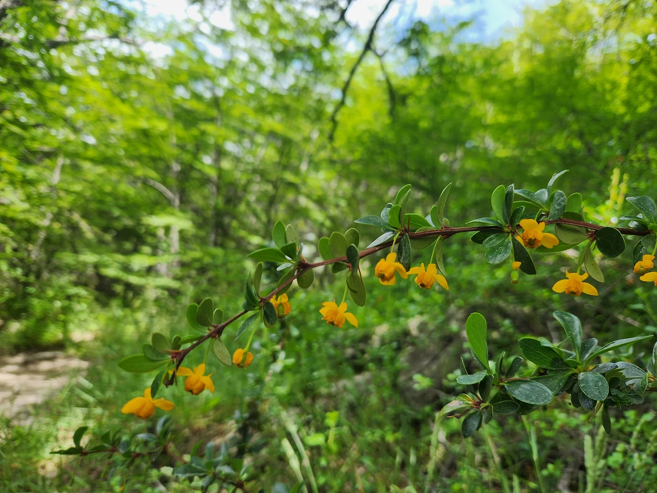 늘 보이는 초록덤불 위에서 노란색 꽃이 아침을 밝히고 있다. 길가의 꽃들은 불 밝히듯 피어있는데 안쪽의 덤불들은 거멓게 죽어있는 듯이 보인다.