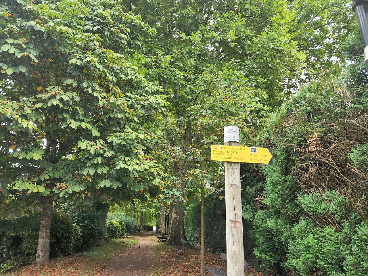 미사 후 드디어 생장을 떠나다. 골목을 다 빠져나가다 보니 첫 안내판이 나온다. 론세스바에스까지 24.5km. 다행히 우리는 9km만 가면 된다.