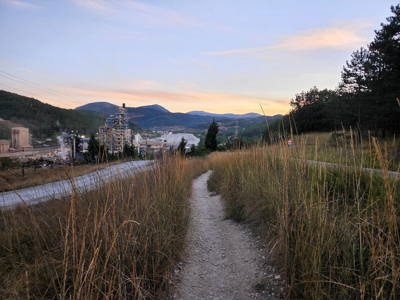 6:50에 수비리 출발, 아직 밝아오기 전이나 작은 마을에 켜진 불들로 어둡지는 않다. 아늑해보이는 그 공간을 벗어나 또 산으로 간다. 마을이 작아 길을 잃지 않아서 다행이다. 한참을 가다보니 거대한 레미콘 공장이 보이고 산티아고 순례자들이 삼삼오오 나타난다.