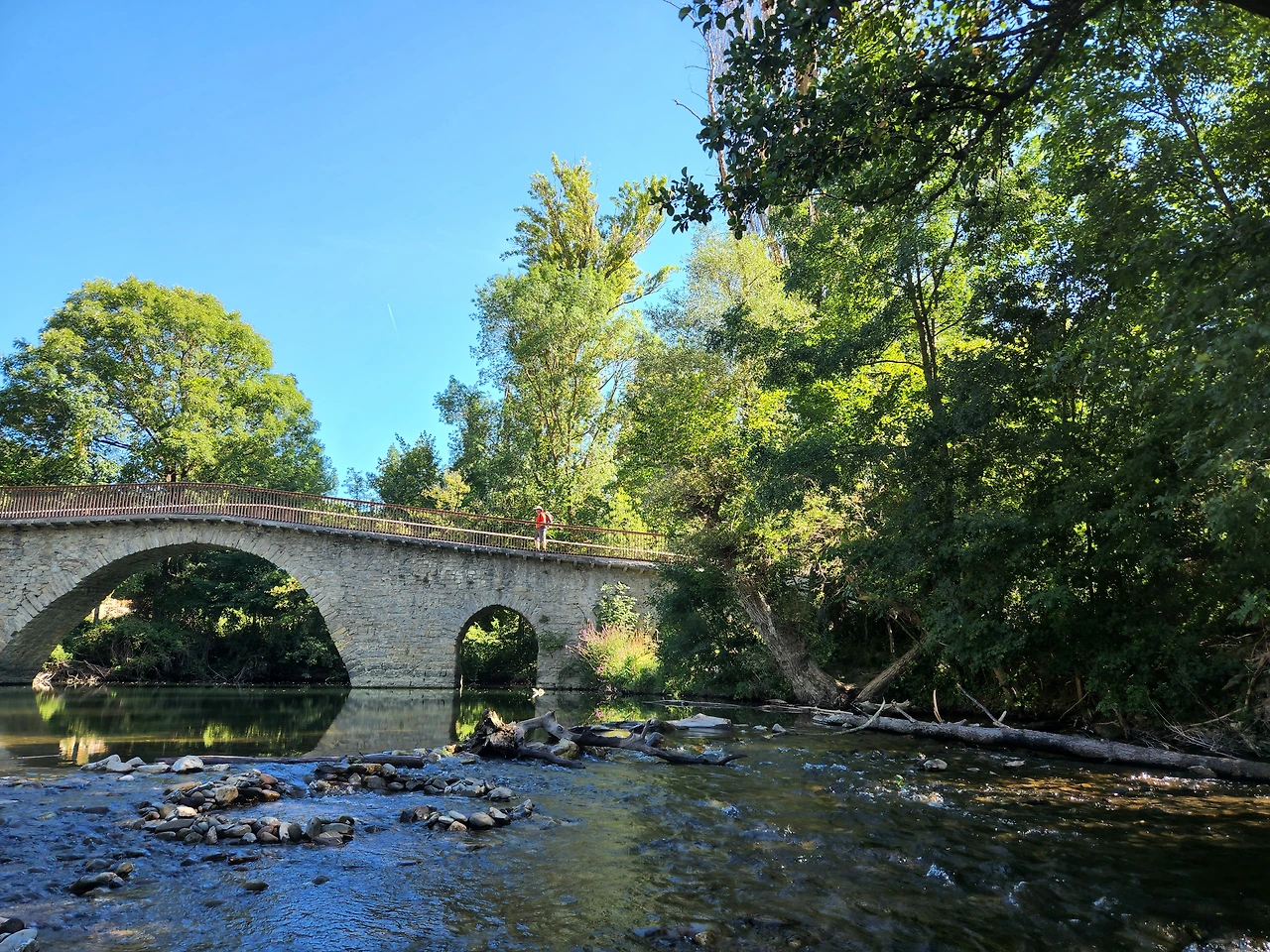 그렇게 들판을 지나 막마지에 이르니 차에 음료를 내리는 청년이 있었다. 그에게는 아침 거리는 없었고 쥬스와 커피가 있다며 돈은 기부를 받는다고 한다. 쥬스 2잔을 시켜서 2 유로를 기부했다. 그는 한국인이냐? 고 묻더니 (감사합니다.. 이쪽으로..) 를 말하며 까미노를 잘 순례하라고 나를 위해 종을 쳐주다. 맑은 종소리에 마음이 경건해져서 서서 성호를 긋고 감사 인사를 전하다.