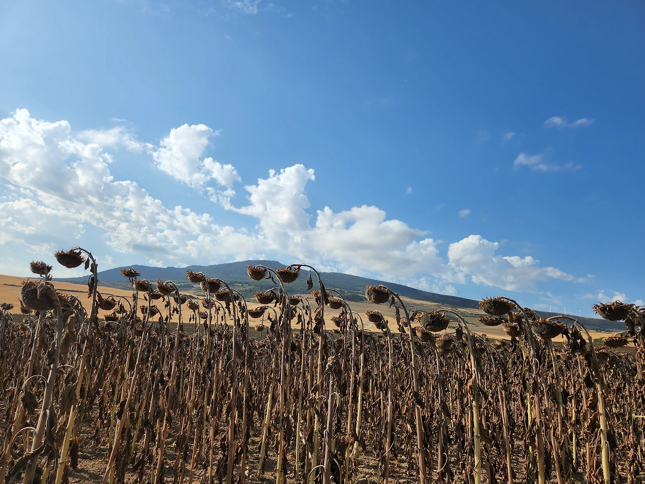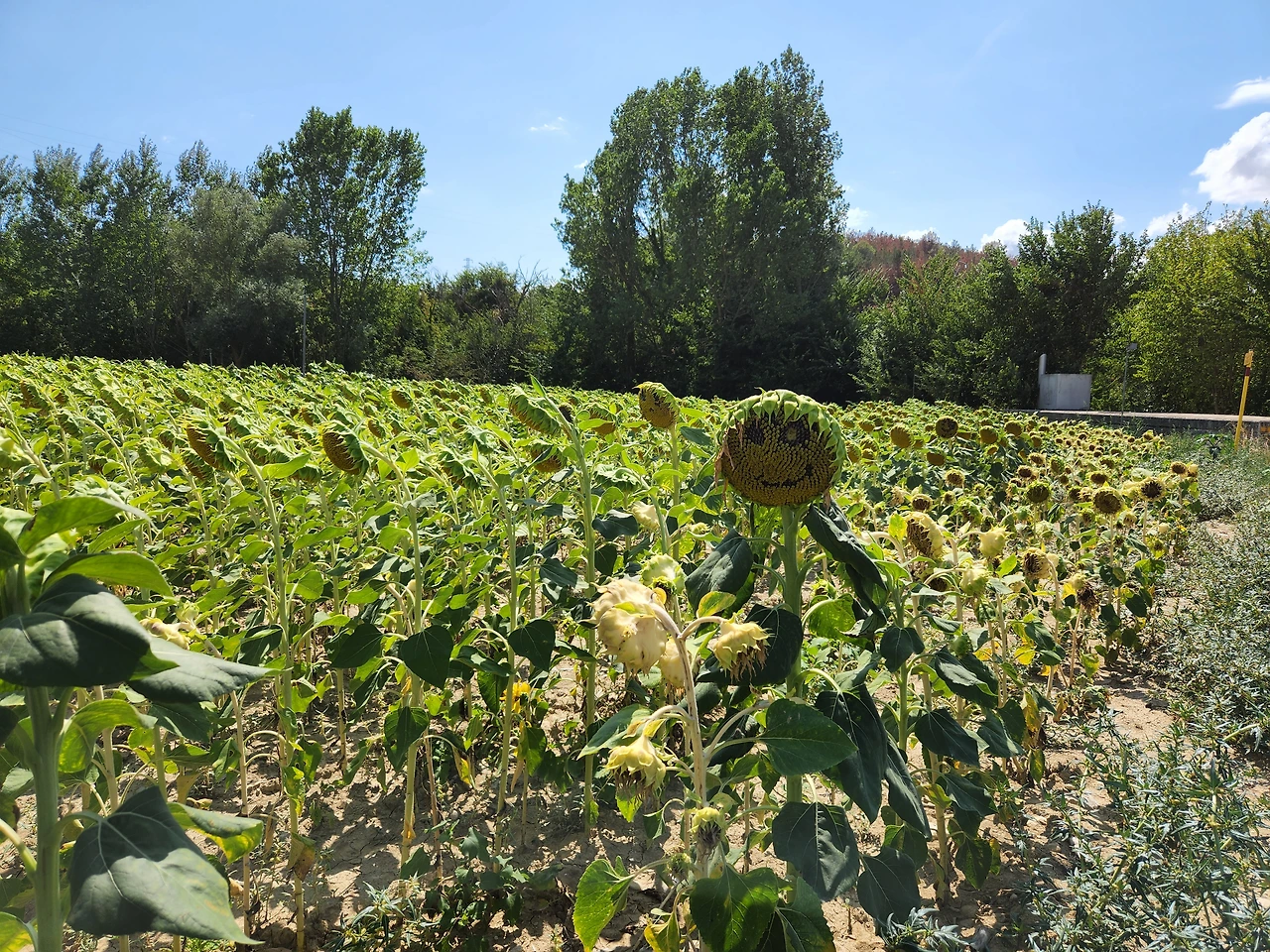 해바라기들이 동쪽을 향하여 까맣게 고개를 숙이고 있다. 마치 장송곡을 들으며 천천히 무릴지어 가는 듯...