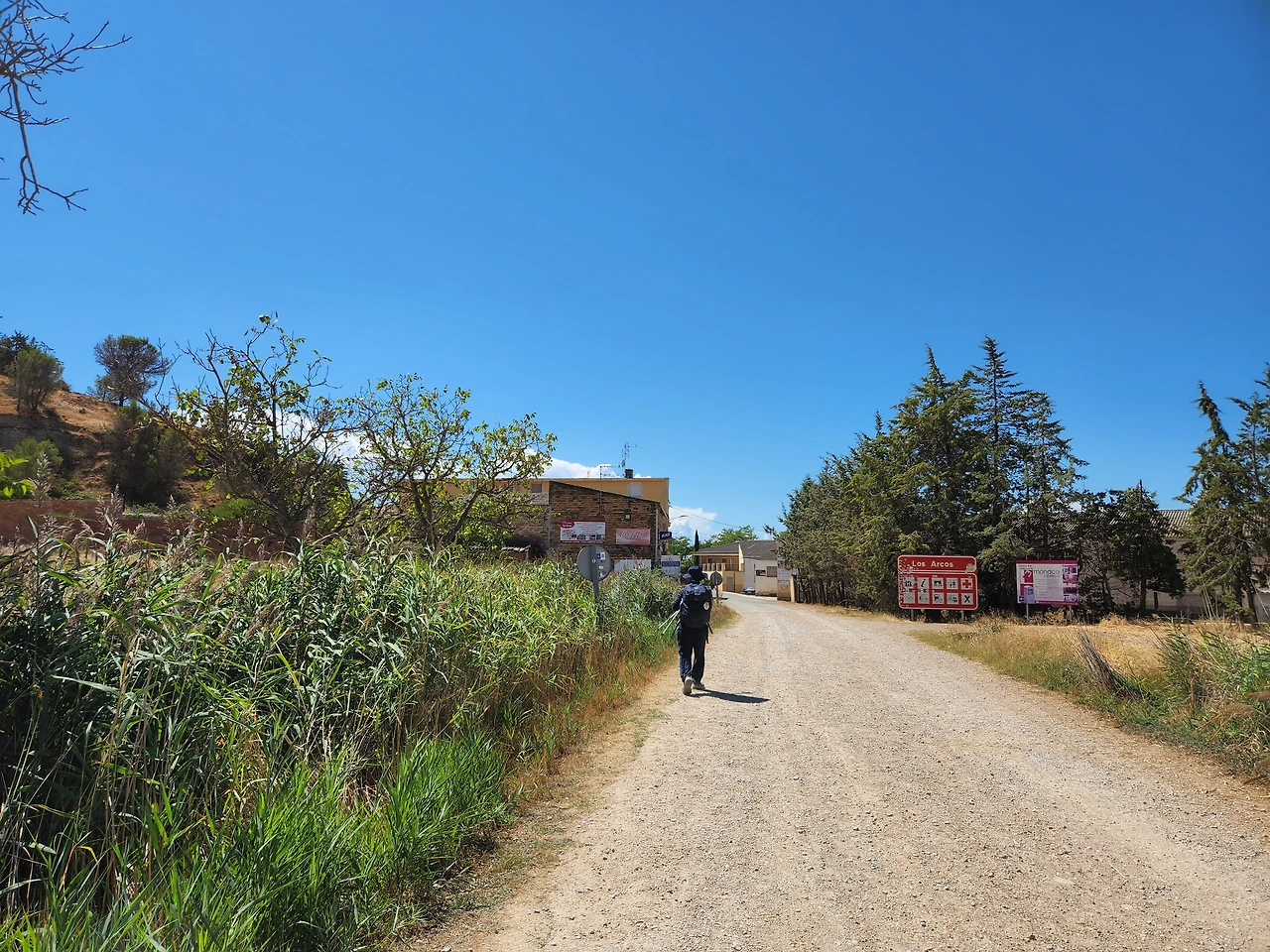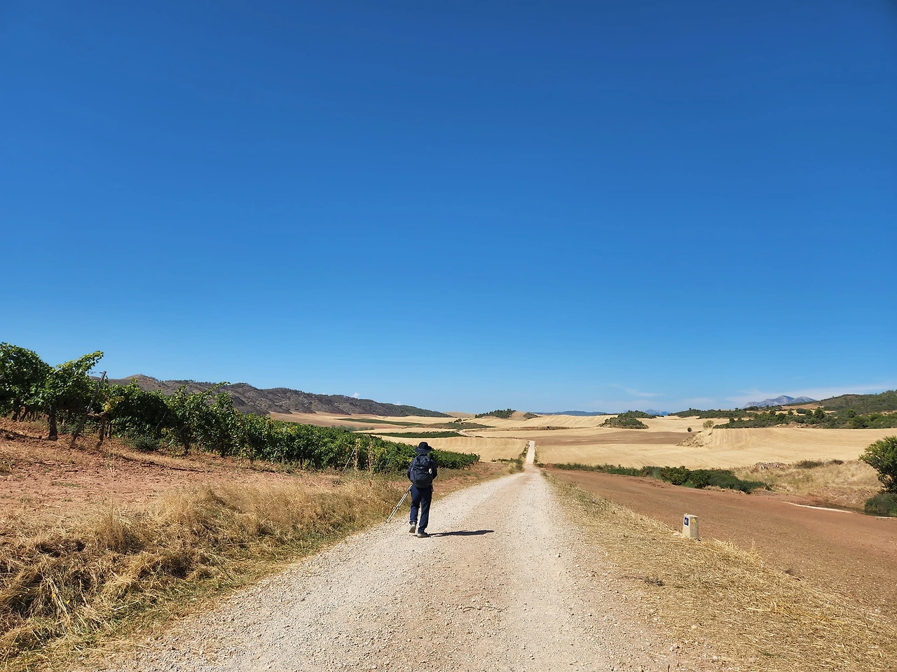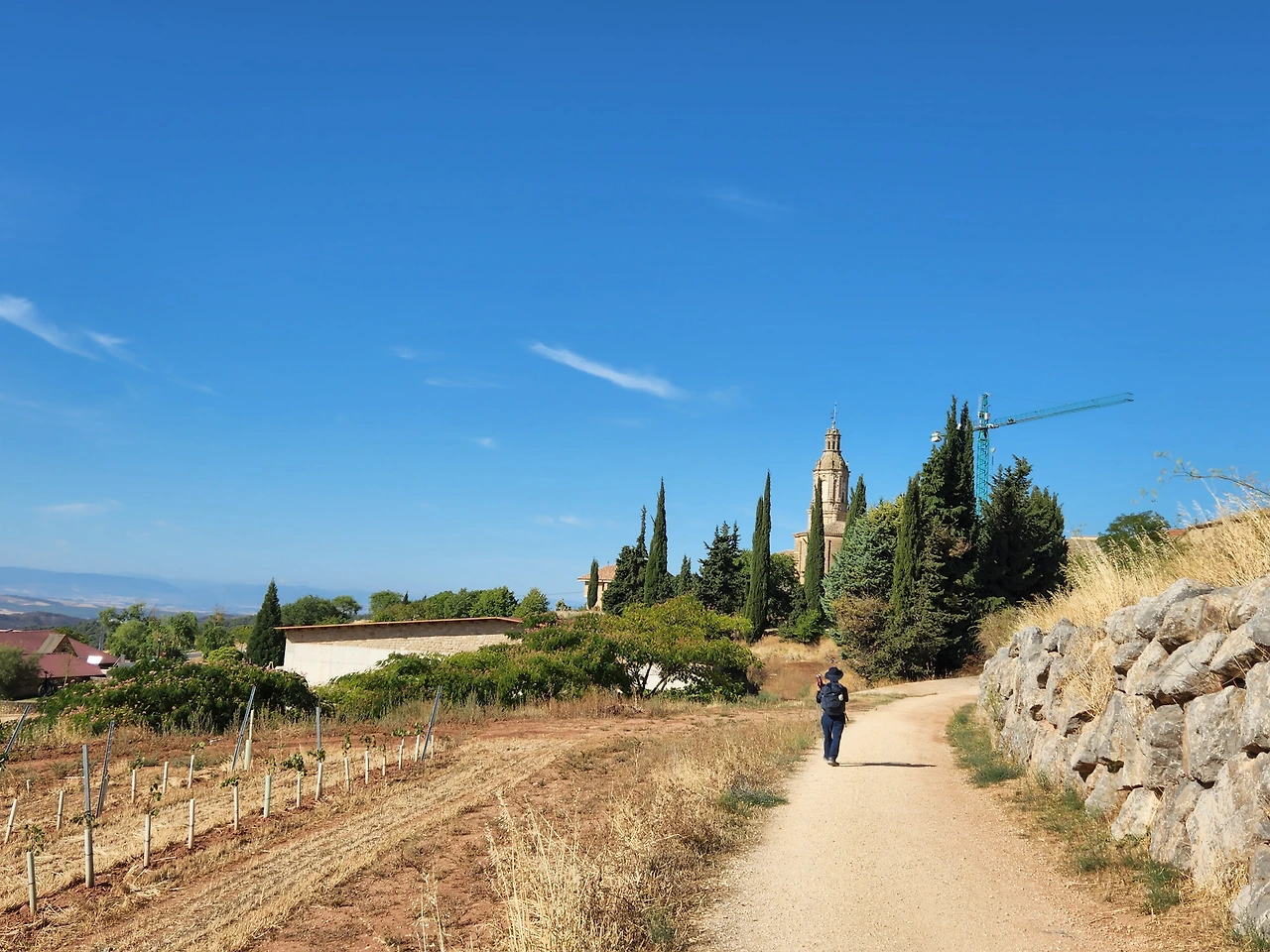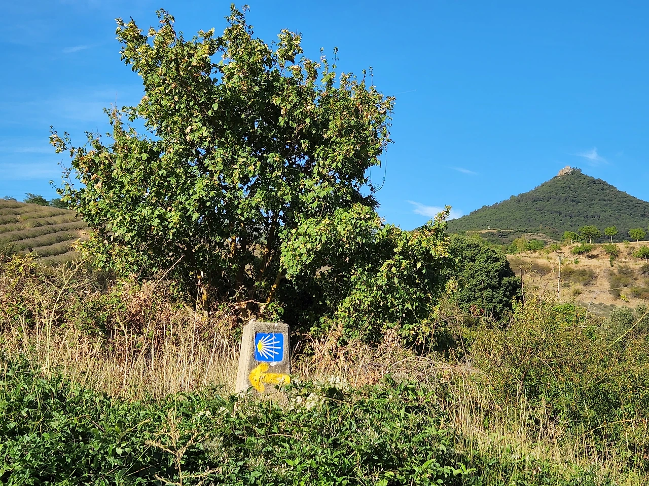 포도주가 들어가서 노곤한게 기분이 좋다. 가다보니 산등성이에 성곽이 보이기 시작한다. 시골의 갈림길에도 안내 표지가 보인다. 가리비 문양과 노란 화살표.. 프랑스쪽은 빨갛고 하얀 줄로 표시됐었는데 아무튼 나타나면 참 반갑다.