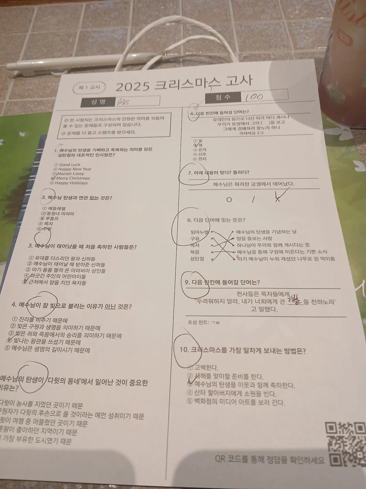 2층으로 올라가 자리 안내를 받고 10번 테이블에 앉았다. 몇 분이 지나 나는 자몽에이드를 1층에서 쟁이고 다시 2층으로 올라가 식전기도 후 자몽에이드를 들이켰다. 가면 이벤트로 크리스마스 고사를 풀게 되는데 성경 내용의 문제와 대충 일반인들도 맞출 수 있는 내용의 문제가 있다. 나는 신학생답게 바로 맞추고
