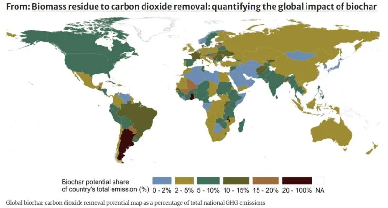 본 연구는 바이오차(Biochar) 를 활용하여 전 세계 국가들의 온실가스(GHG) 배출 감축에 기여할 수 있는 잠재력을 평가한 결과를 시각적으로 표현한 것이다. 지도는 각 국가별 바이오차의 탄소 제거 가능성을 분석하고, 이를 국가의 총 온실가스 배출량 대비 바이오차 활용을 통한 탄소 제거 비율로 나타냈다.