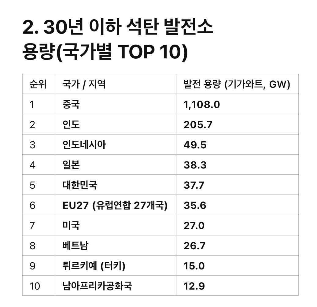 • 석탄 발전소의 경제적 수명은 30~40년 이상이므로, 최근 30년 내 지어진 발전소들은 2030년 이후에도 계속 운영될 가능성이 높음.