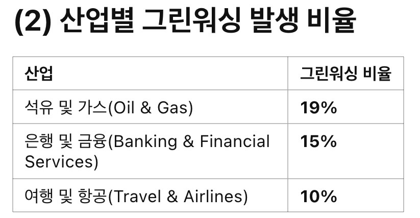 석유·가스 업계가 **가장 높은 비율(19%)**을 기록하며, 탄소 배출 감축 실질적 조치 부족으로 인해 ESG 리스크가 높은 산업으로 평가됨 oai_citation:6‡KPMG_Law_Greenwashing_1740280172.pdf.