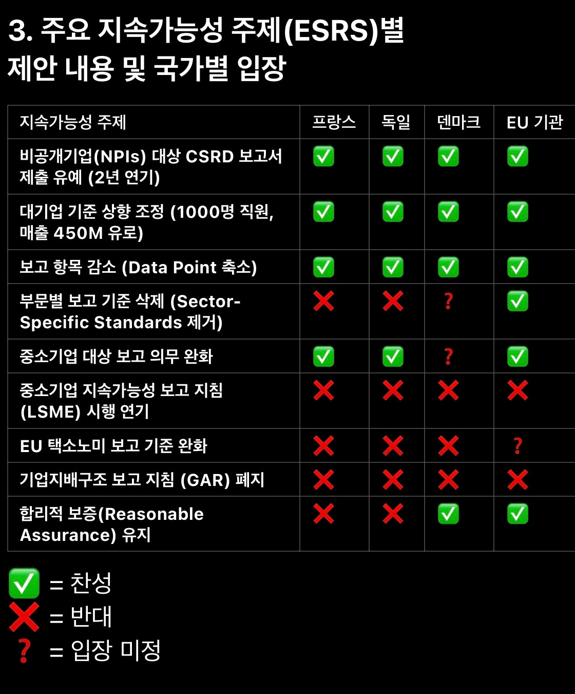이러한 변화는 기업의 행정적 부담을 줄이는 효과가 있지만, 동시에 ESG 정보 공개의 투명성을 저하시킬 위험도 존재한다. 기업들은 향후 EU 규제 동향을 면밀히 분석하고 대응 전략을 마련할 필요가 있다.