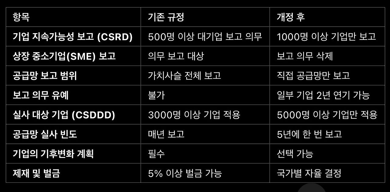 • 중소기업(SME)은 ESG 보고 의무가 사라졌지만, 대기업과의 거래에서 지속가능성 요구가 증가할 가능성이 있음
