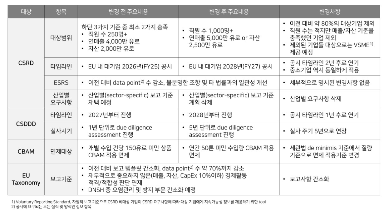 기업 실사 대상 범위, 이해관계자 범위, 중소기업 보호, 민사책임, 기후전환계획 등 대대적인 규제 간소화를 추진