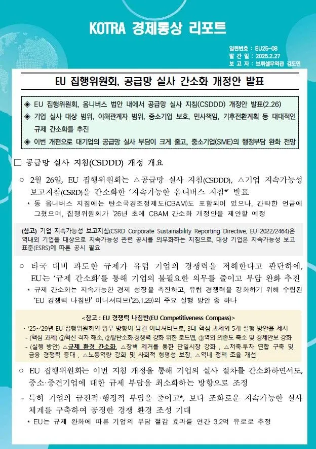 EU 집행위원회, 옴니버스 법안 내에서 공급망 실사 지침(CSDDD) 개정안 발표(2.26)