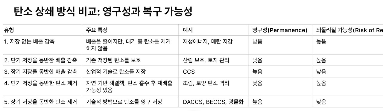 • 탄소 제거(Carbon Removal)는 대기 중 탄소를 직접 줄이는 방식이지만, 저장 방식에 따라 효과가 다를 수 있다.