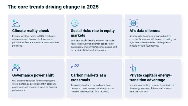 2025년에는 기후 변화, 사회적 리스크, AI 기술, 기업 거버넌스, 탄소 시장, 에너지 전환과 관련된 여러 핵심 트렌드가 글로벌 경제 및 투자 환경을 변화시킬 것으로 예상된다.