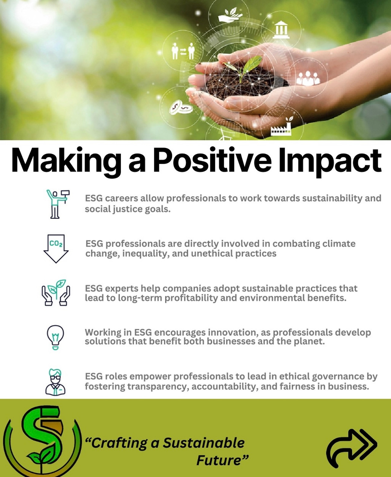 ESG 전문가로서 경력을 쌓으면 지속가능성과 기업의 장기적 성공을 동시에 이끌어 갈 수 있는 기회를 얻을 수 있음.