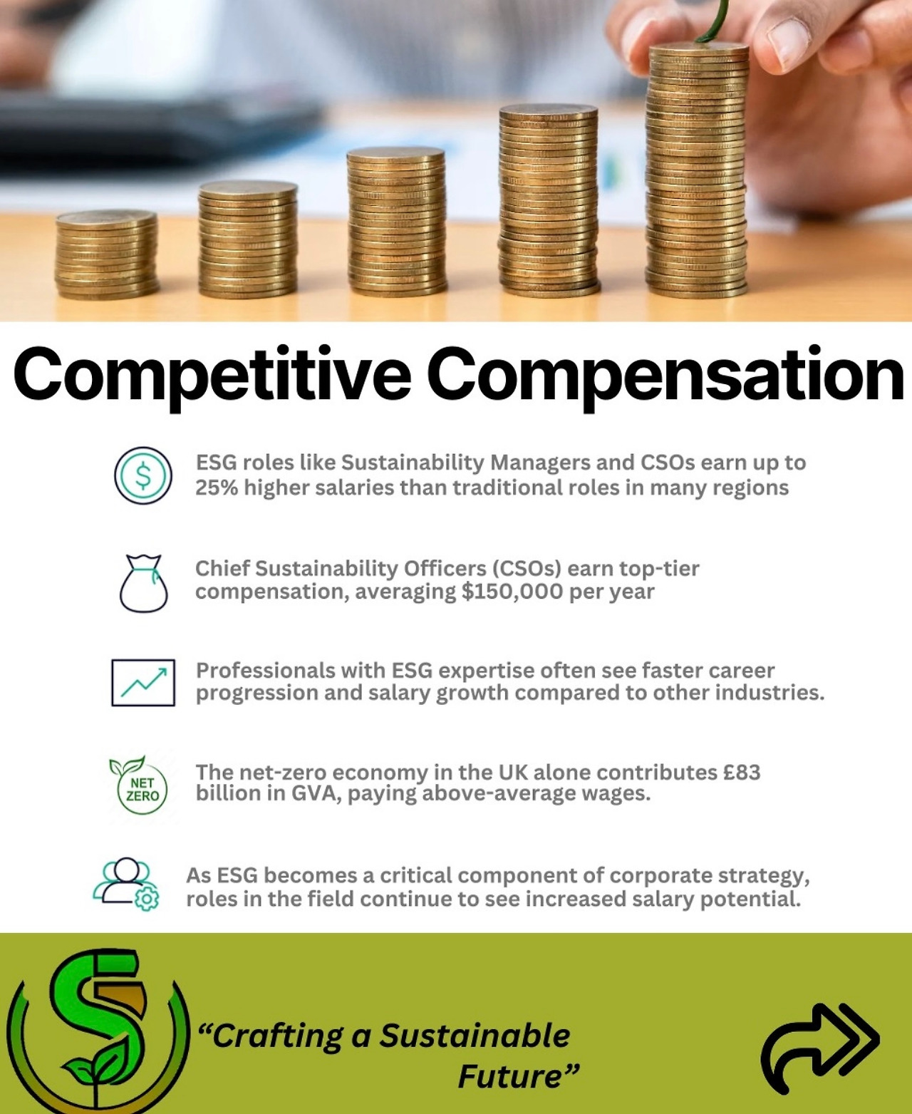 ESG 경력은 높은 성장 가능성과 안정적인 직업 전망을 제공할 뿐만 아니라, 경쟁력 있는 급여, 직원 만족도 증가, 사회적 영향력 등의 다양한 장점을 갖고 있음.