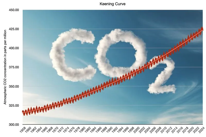 • 1958년 약 315ppm에서 2024년 약 425ppm까지 증가.