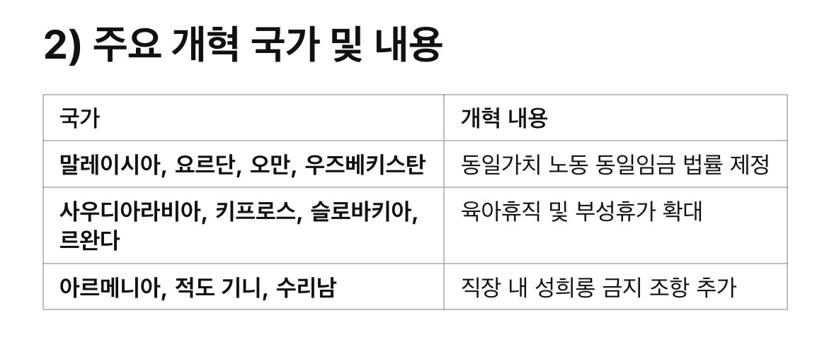 • 2022~2023년 동안 18개국이 성평등 법제 개혁 단행.