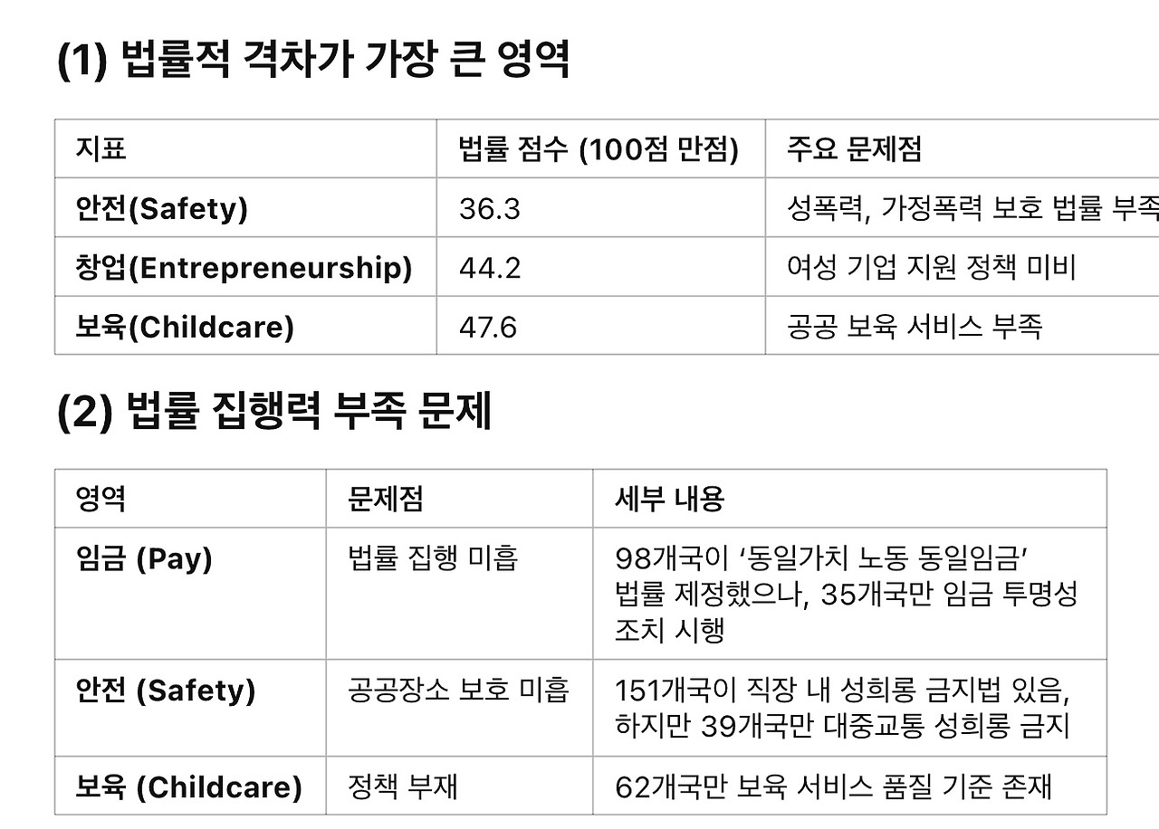 • 여성의 법적 권리는 남성의 평균 64.2% 수준 (기존 추정치 75%보다 낮음).