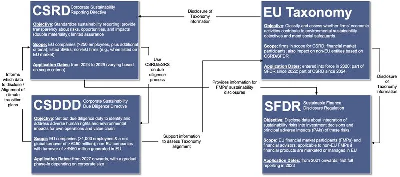 본 문서는 EU의 주요 지속가능성 규제인 CSRD, CSDDD, EU Taxonomy, SFDR을 상세히 설명하고, 이들 규제가 어떻게 상호 연계되는지 분석한다.