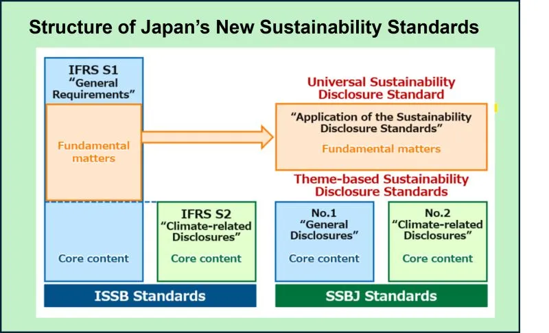 일본은 국제 지속가능성 공시 기준(ISSB, International Sustainability Standards Board)과 정렬된 새로운 지속가능성 공시 기준(SSBJ, Sustainability Standards Board of Japan)을 개발하고 있다.