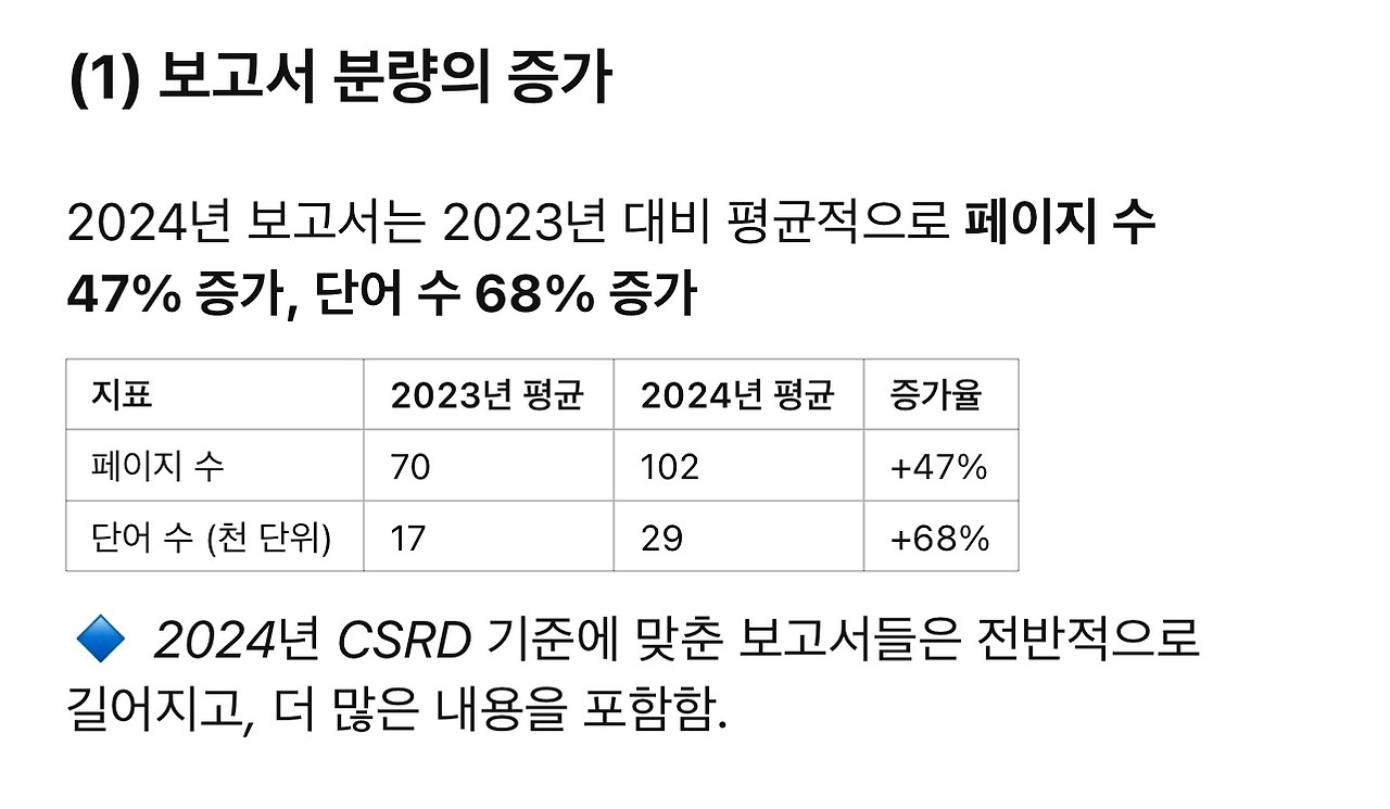 • CSRD 도입 이후 지속가능성 보고서의 분량이 크게 증가