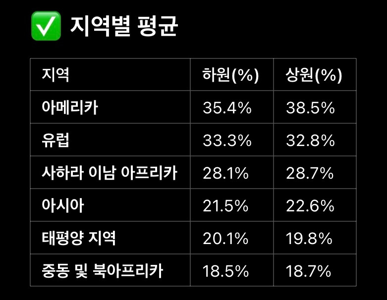 • 아메리카와 유럽 지역이 여성 국회의원 비율이 가장 높음.