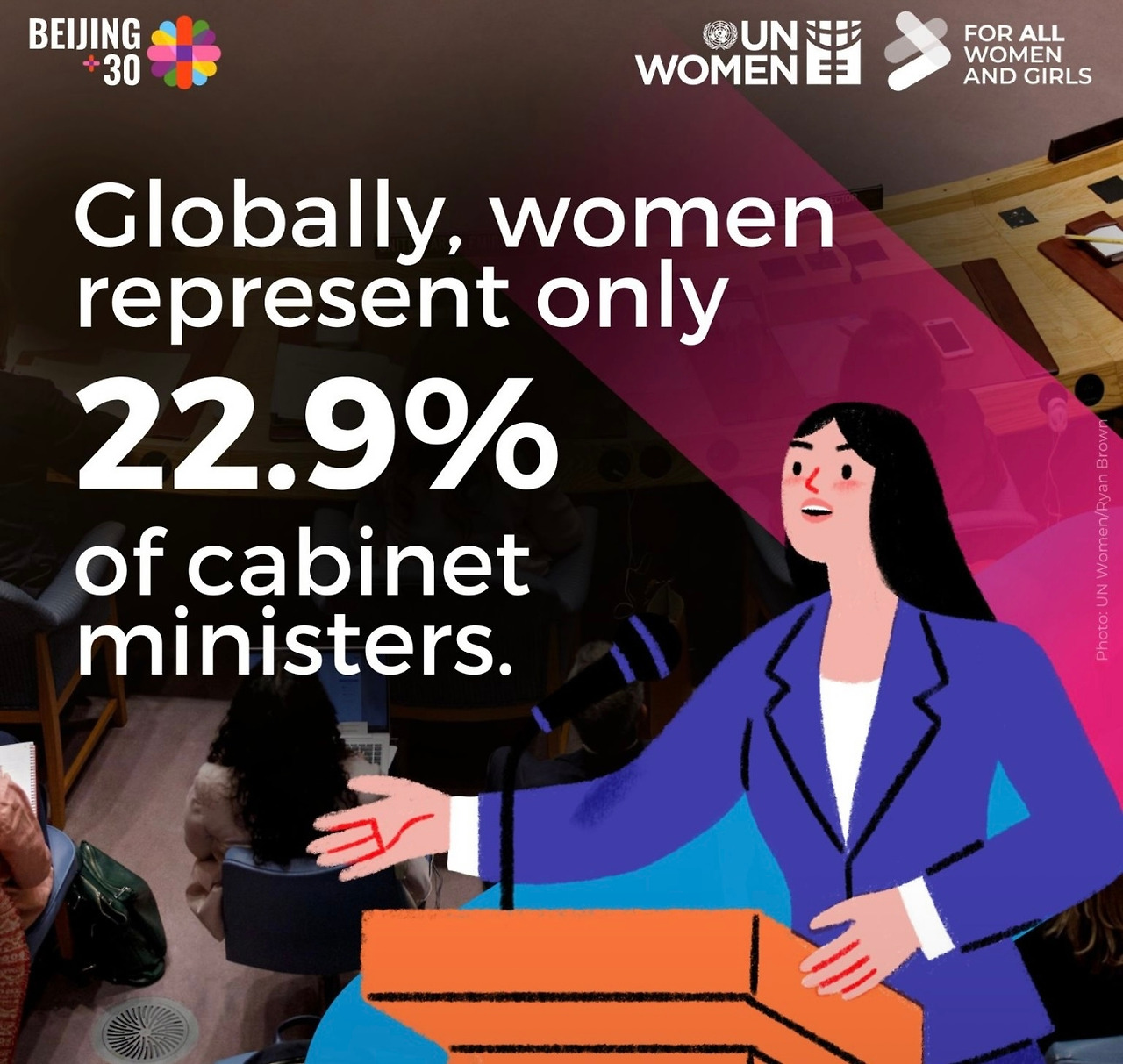 여성이 국가 또는 정부 수반으로 재직하는 국가는 25개국에 불과하며, 내각 장관 중 여성은 23% 미만이다.