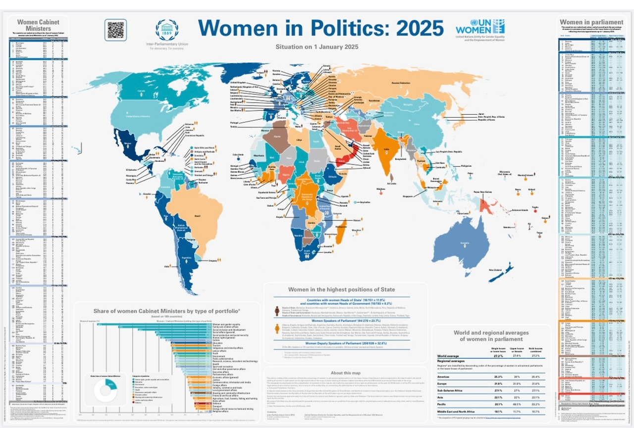 국제의회연합(IPU)과 유엔 여성기구가 만든 "정치 속의 여성: 2025" 지도는 2025년 1월 1일 현재 행정직과 국가 의회의 여성에 대한 새로운 데이터를 제시합니다.