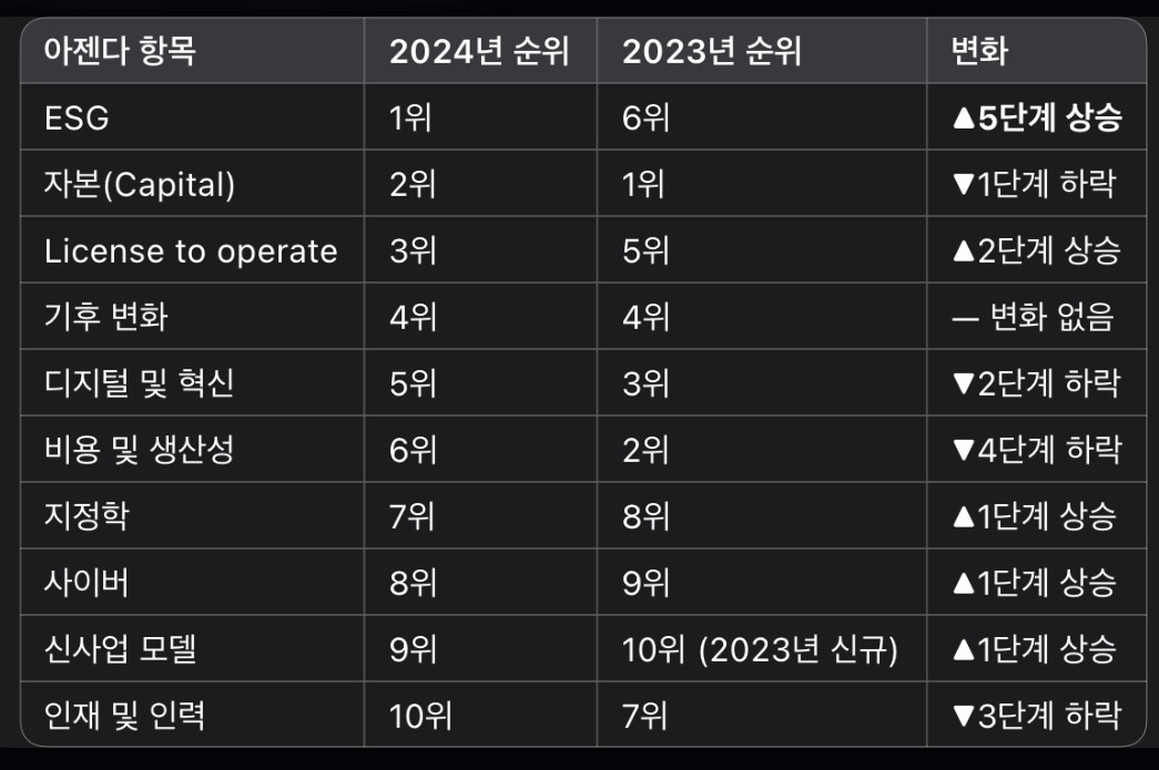 • ESG의 중요성 급상승: 2024년에는 ESG가 기업 경영의 최우선 과제로 부상함. 이는 지속가능성과 비재무 리스크 대응이 기업 생존과 직결됨을 보여줌.