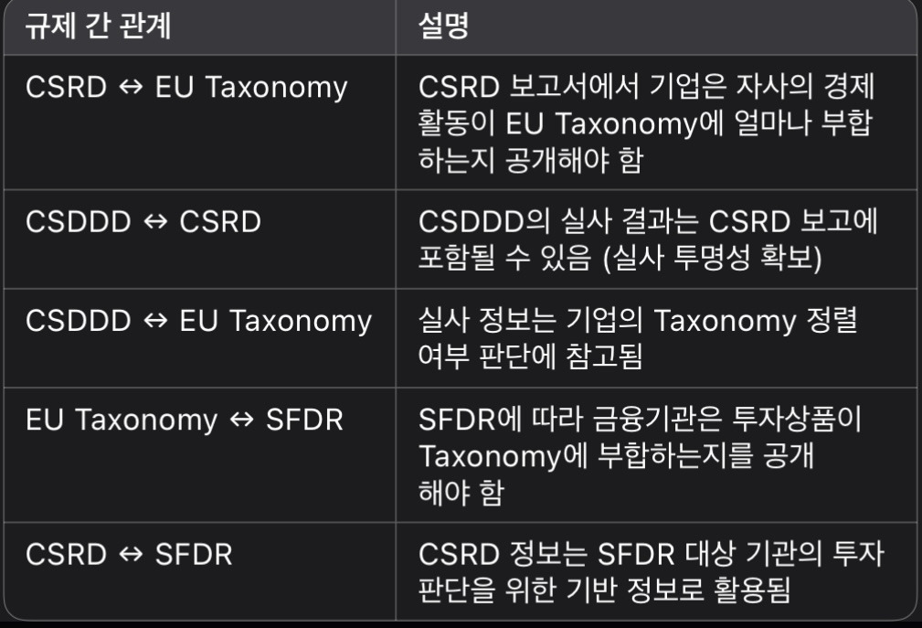 특히 CSRD, CSDDD, EU Taxonomy, SFDR은 각각 정보공개, 실사, 분류체계, 금융투자 정보공개의 역할을 수행하면서 유기적으로 연결되어 있음