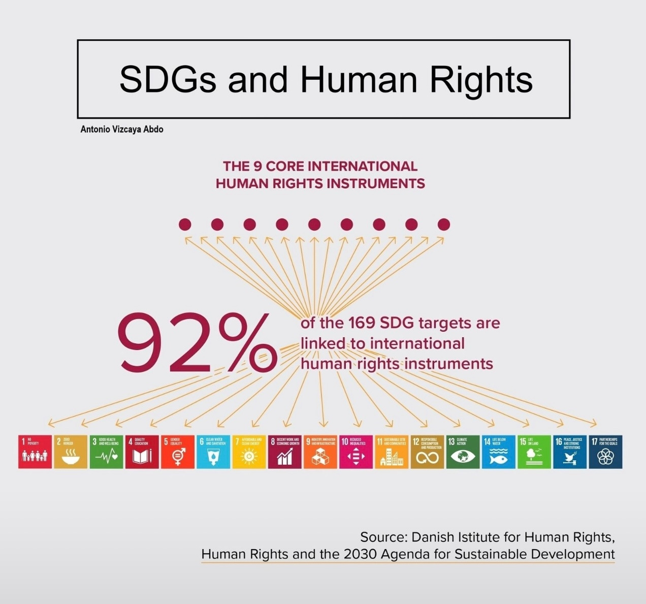 지속가능발전목표(SDGs)와 인권 간의 연계는 포괄적이고 지속적인 글로벌 발전을 달성하는 데 매우 중요합니다. 169개의 지속가능발전목표(SDG) 목표 중 92% 이상이 세계인권선언(Universal Declaration of Human Rights)과 같은 국제인권기구와 시민적·정치적 권리에 관한 국제규약(International Covenant on Civil and Political Rights, ICCPR), 아동권리협약(Convention on the Rights of the Child, CRC)을 포함한 주요 조약과 연결되어 있다.