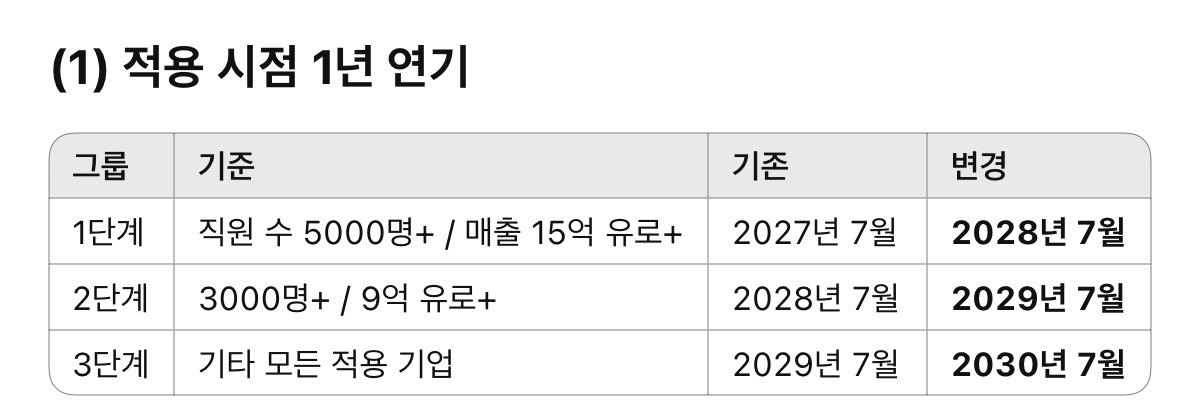 대기업을 대상으로 하는 CSDDD(Corporate Sustainability Due Diligence Directive)의 전환 기한과 1단계 적용 기간을 1년 연장합니다.