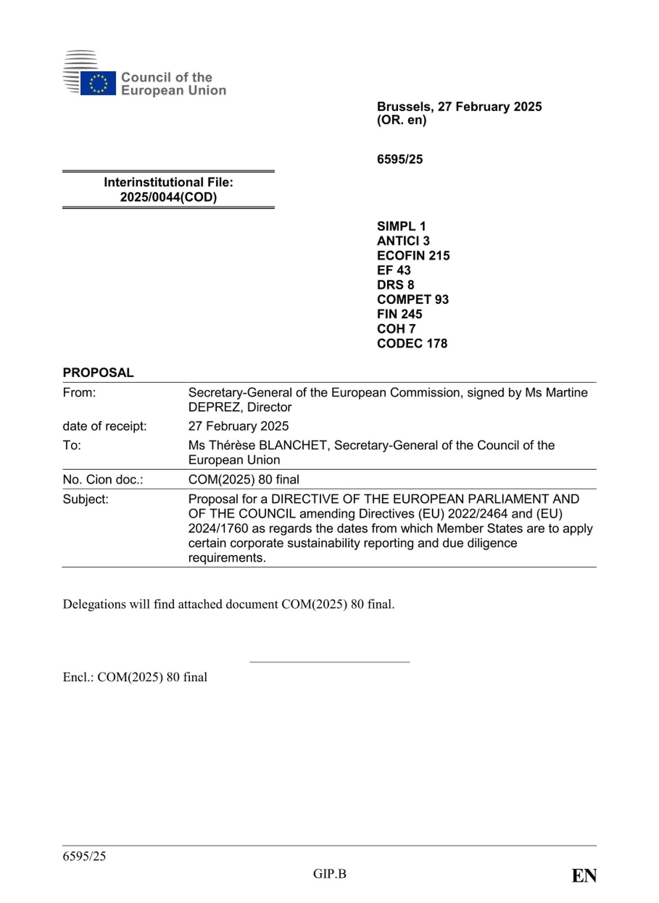 • European Commission. Proposal for a Directive amending Directives (EU) 2022/2464 and (EU) 2024/1760 as regards the dates from which Member States are to apply certain corporate sustainability reporting and due diligence requirements, COM(2025) 80 final.