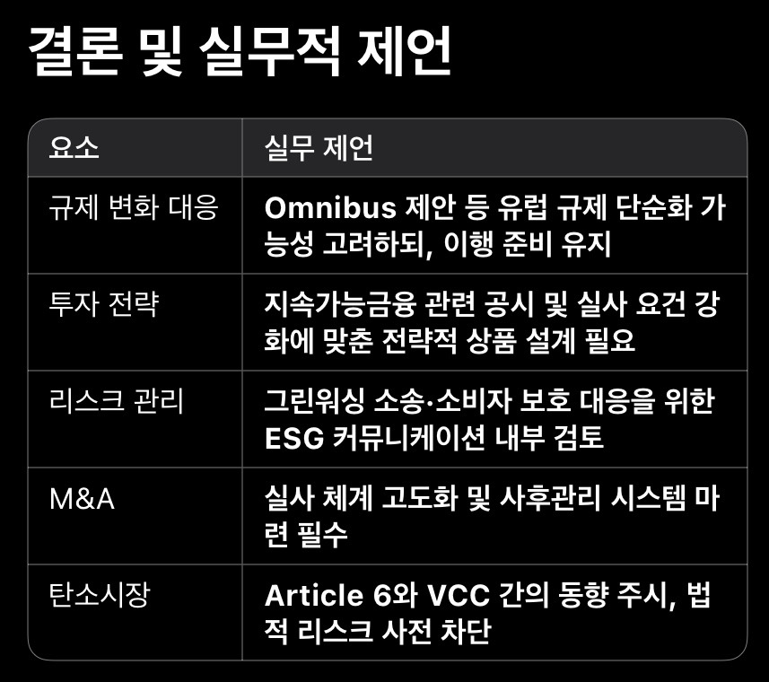 • ESG 공시 및 실사 요구는 이미 발효되었으며, 규제가 불확실하더라도 회피는 위험.