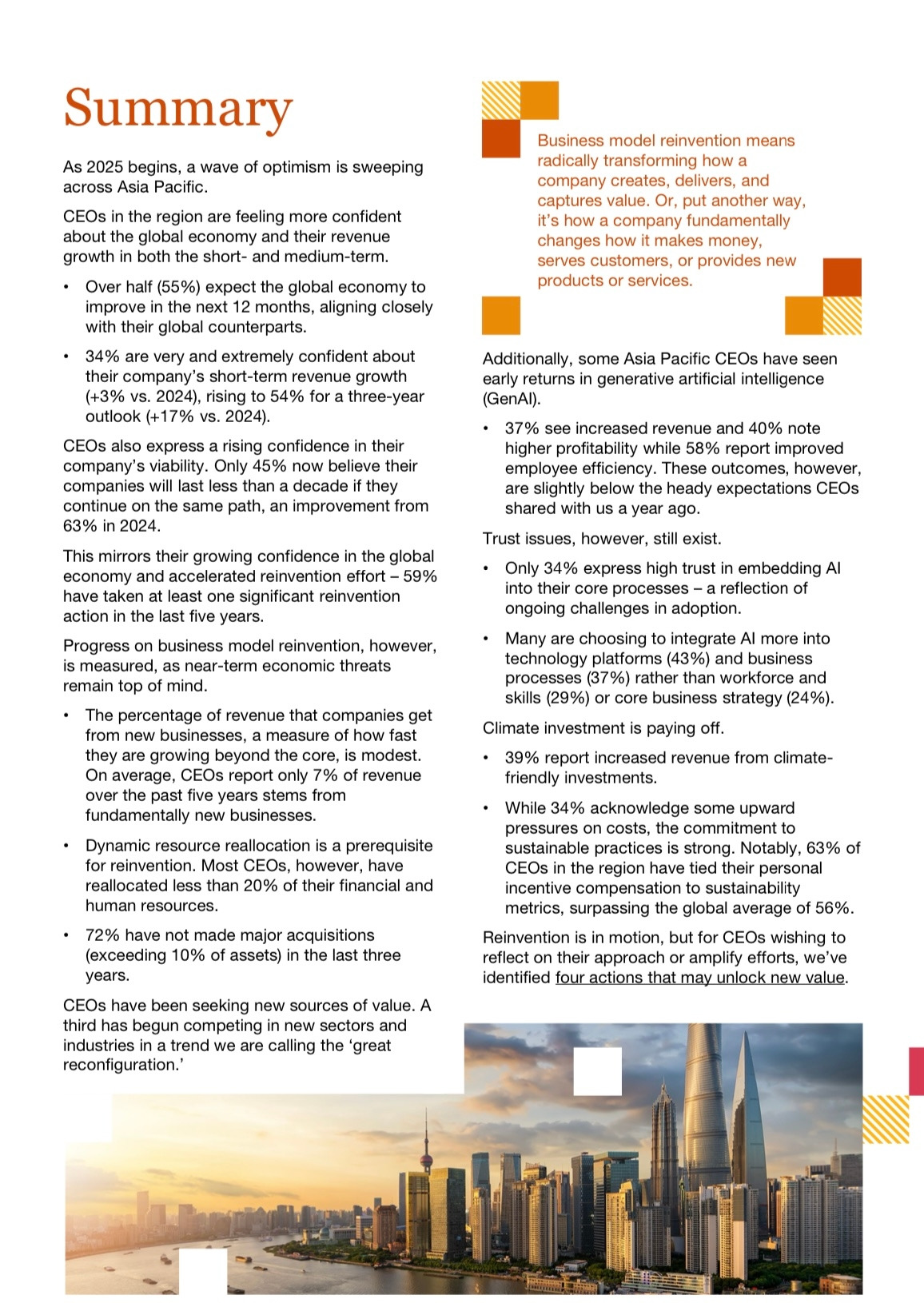 2025년을 맞이하며 아시아 태평양 지역 CEO들은 글로벌 경제와 기업의 단기 및 중기 성장에 대한 자신감을 보이고 있다.