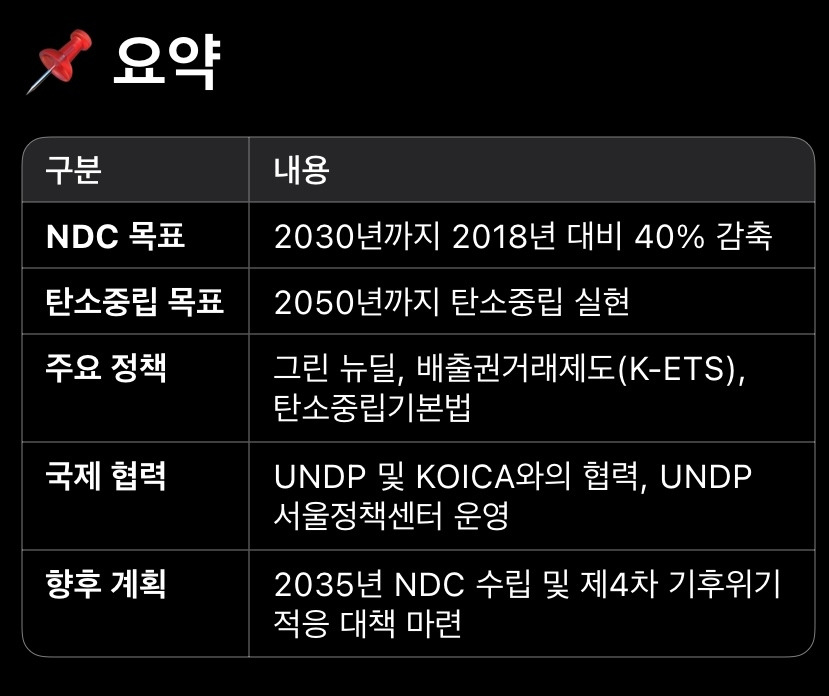 • NDC는 파리협정에 따라 각국이 제출하는 기후행동계획으로, 온실가스 감축 및 기후적응 목표를 포함.