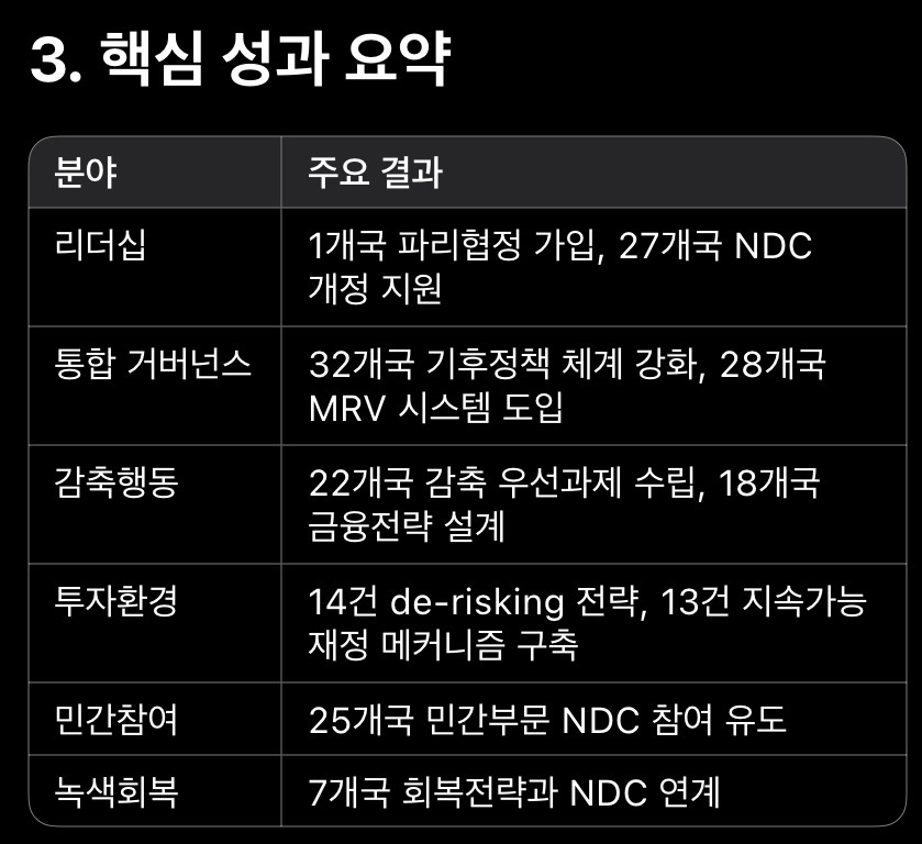 • MRV(측정·보고·검증): 28개국이 기후재정·성과 추적 시스템 구축.