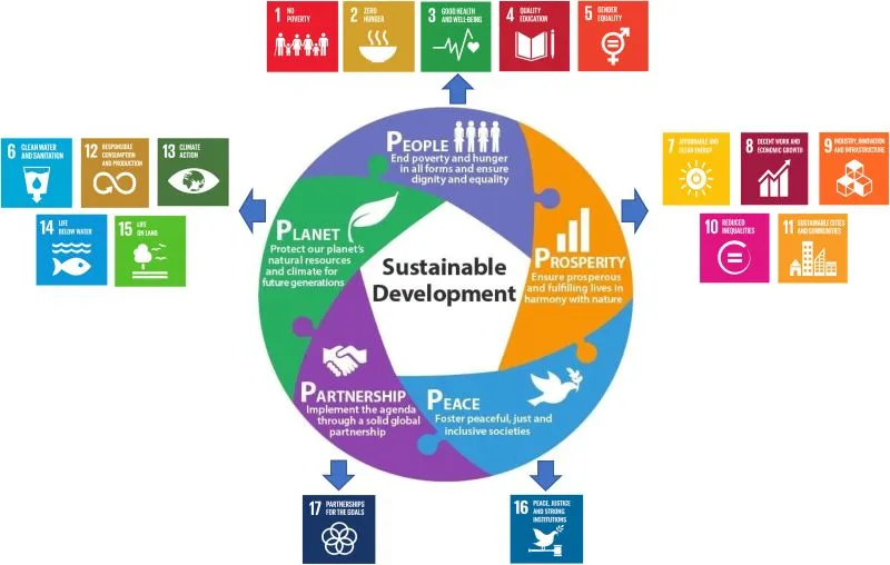 SDGs(지속가능발전목표)를 달성하기 위해서 사람, 번영, 지구, 평화, 파트너십의 5P 영역에서 균형 있게 접근해야 한다는 것을 강조하고 있어. 이를 통해 지구와 인류의 번영을 함께 달성하려는 국제사회의 협력 메시지