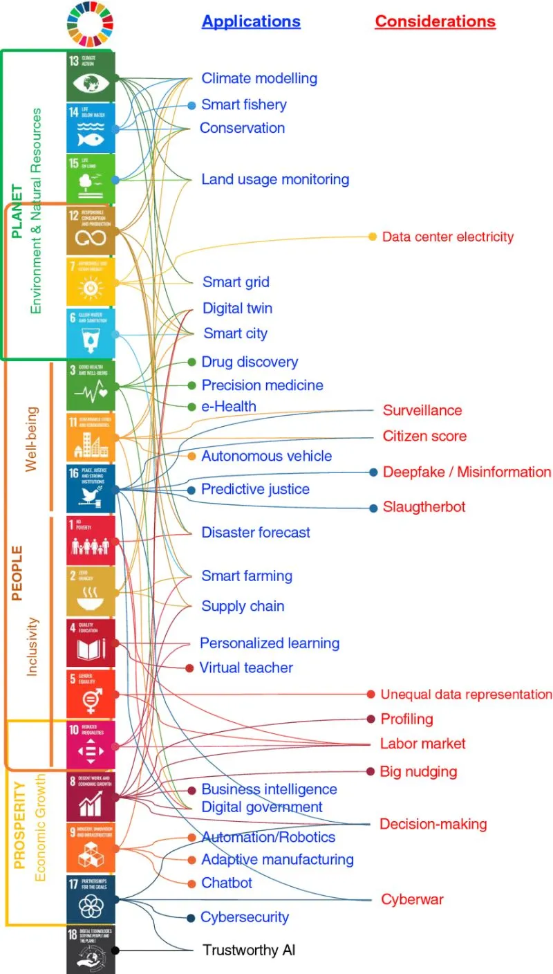 지속가능개발목표(SDGs)와 AI의 교차점에서 가장 많이 논의되는 주제는 AI가 건강, 에너지, 교육, 기후 변화 대응 분야의 발전을 가속화하는 동시에 AI 도입으로 인해 발생하는 윤리적, 사회적, 거버넌스적 과제를 해결하는 방법에 관한 것입니다. SDG 3(건강과 웰빙)과 SDG 7(저렴하고 깨끗한 에너지)이 가장 두드러지지만, AI의 잠재력과 위험은 17개 SDG 전체에 걸쳐 있습니다.