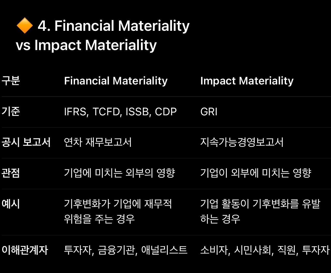 • 중요성: 지속가능성과 관련된 리스크 및 성과를 완전하게 이해하려면 두 가지 관점이 모두 필요함
