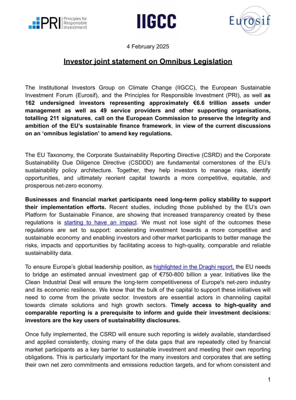 유럽 지속가능 투자 포럼(Eurosif), 기후변화 관련 투자자 그룹(IIGCC), 책임투자 원칙(PRI)을 포함한 162명의 투자자와 49개의 서비스 제공 업체 및 기타 지원 기관(총 211개 서명자)은 EU 지속가능 금융 프레임워크의 무결성과 야심을 유지하기 위해, 주요 규정을 개정하는 ‘옴니버스 법안’ 논의와 관련하여 유럽연합 집행위원회에 요청하고 있다.
