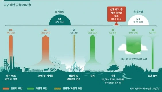 • 메탄은 현재 전 세계 온실가스 배출의 약 16%를 차지하지만, 전체 온난화의 약 30% 정도를 유발하는 것으로 평가돼.