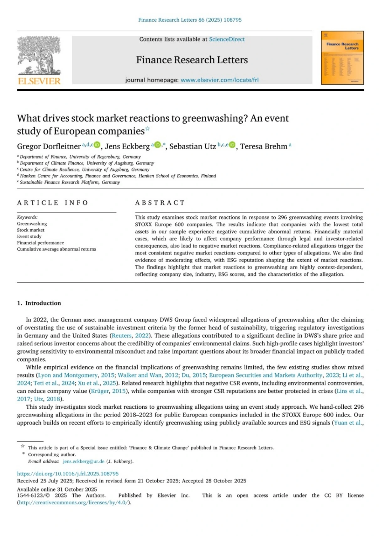• Dorfleitner, G., Eckberg, J., Utz, S., & Brehm, T. (2025). What drives stock market reactions to greenwashing? An event study of European companies. Finance Research Letters, 86, 108795.