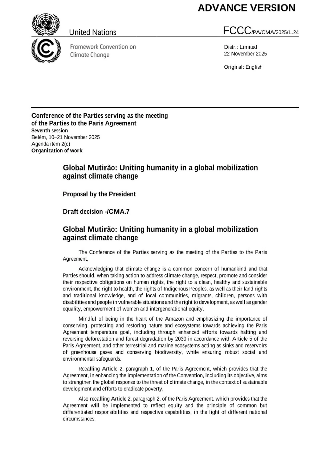 본 문서는 2025년 브라질 베렘(Belém)에서 열린 CMA.7(파리협정 당사국회의 제7차 회의)에서 채택된 결의 초안으로,