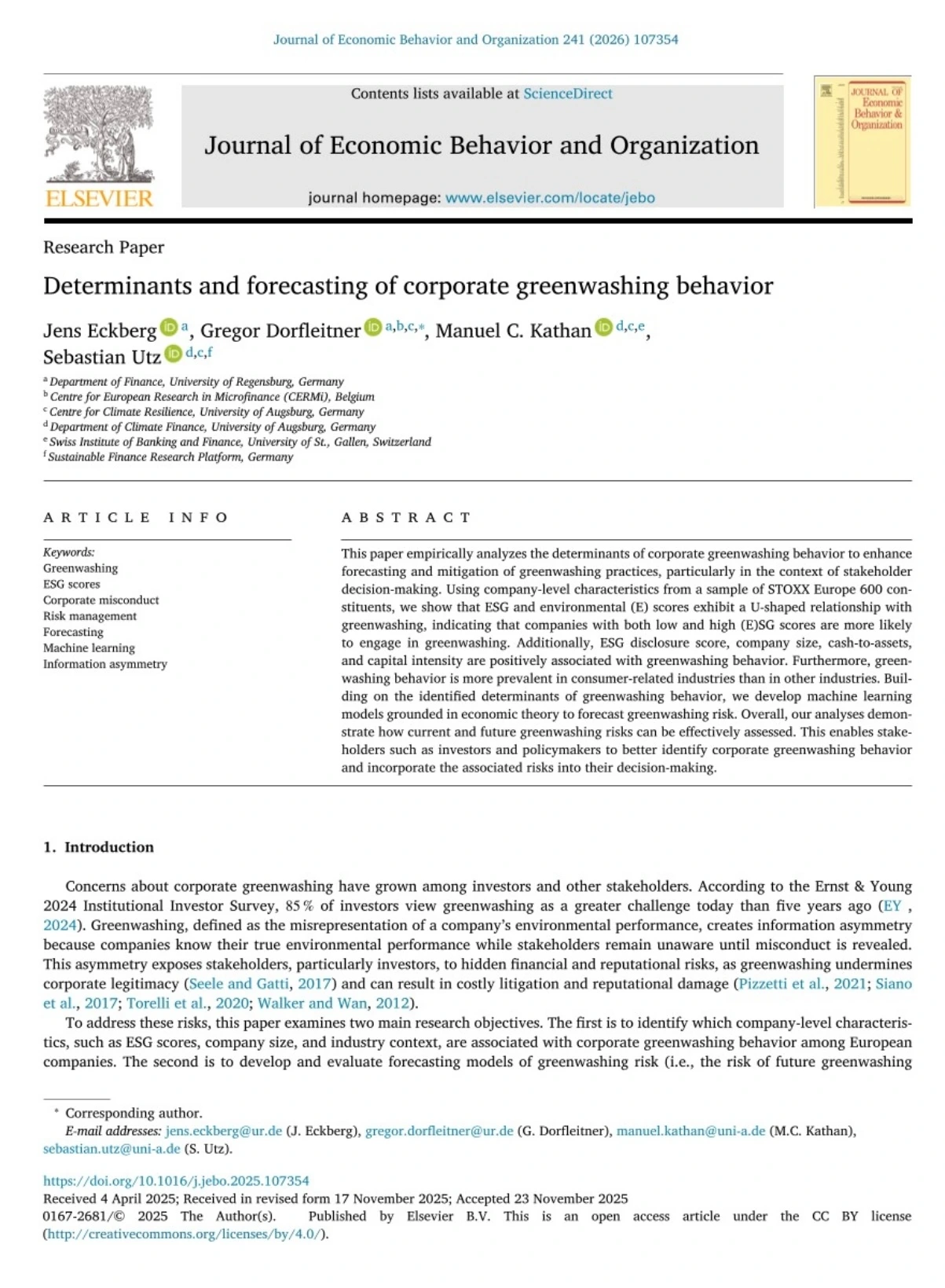 Eckberg, J., Dorfleitner, G., Kathan, M. C., & Utz, S. (2026). Determinants and forecasting of corporate greenwashing behavior. Journal of Economic Behavior and Organization, 241, 107354. https://doi.org/10.1016/j.jebo.2025.107354