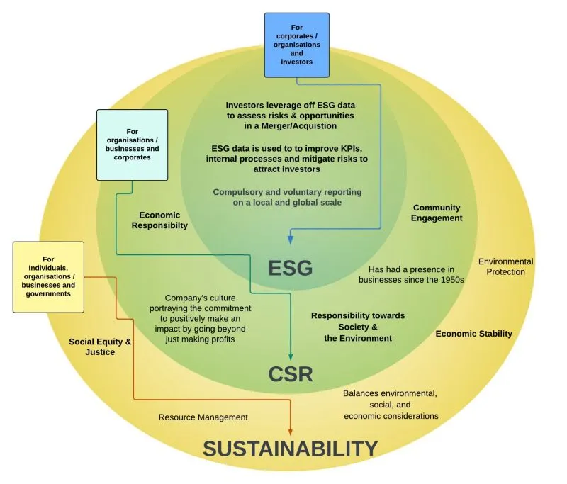 저는 지속가능성 발전의 가장 흔한 장애물 중 하나가 용어라고 생각해 왔습니다. ESG, CSR, 지속가능성은 종종 혼용되지만, 각 용어는 서로 다른 목적, 다른 대상, 다른 결과를 가져옵니다. 이 이미지는 세 가지 개념 간의 관계를 아름답게 포착하고 있습니다.