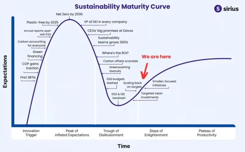지속가능성(ESG) 이니셔티브가 기업 및 사회에서 어떻게 발전하고 있는지를 나타내는 **Sustainability Maturity Curve(지속가능성 성숙 곡선)**이다. 이 곡선은 기술 성숙 곡선과 유사한 패턴을 따르며, **5단계(혁신 촉진, 기대의 정점, 환멸의 골짜기, 깨달음의 경사, 생산성의 고원)**로 구분된다.